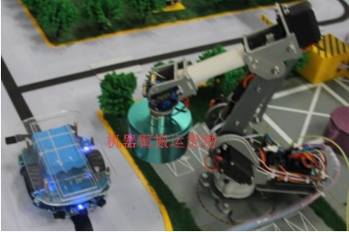 對于不規則貨物,可采用機器臂控制系統裝卸貨。六自由度機械臂的臂部由大臂、小臂組成,一般具有兩個(gè)自由度,即伸縮、回轉、俯仰或升降,采用單片機控制運動(dòng)軌跡。當小車(chē)到達裝卸貨指定地點(diǎn)時(shí),通過(guò)無(wú)線(xiàn)向管理平臺發(fā)出命令,管理平臺接收到后,通過(guò)無(wú)線(xiàn)通信向機器臂控制器發(fā)送裝卸貨指令,控制器接收到命令后,就按照指定的取貨位置,操作機器臂經(jīng)過(guò)回轉、伸縮、升降、俯仰等幾組動(dòng)作組合,實(shí)現貨物的自動(dòng)裝卸。貨物裝卸完成后,運輸車(chē)自動(dòng)離開(kāi)。