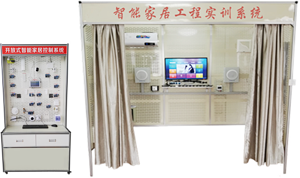 智能家居網(wǎng)板實(shí)訓系統主要由環(huán)境感知設備、安防門(mén)禁設備、控制設備、視頻監控設備、智能網(wǎng)關(guān)、智能終端、以及鋁合金鋼架結構組成。