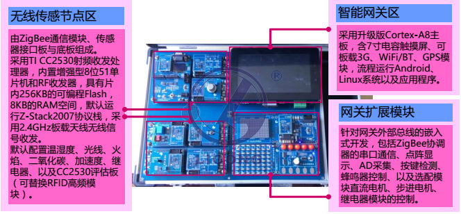 平臺主要包括 ZigBee 無(wú)線(xiàn)傳感器節點(diǎn)、升級版 Cortex-A8 智能網(wǎng)關(guān)、以及網(wǎng)關(guān)擴展模塊等硬件資源。如圖所示: