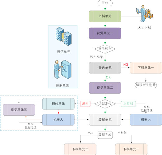 本系統在出廠(chǎng)時(shí),標配了一套應用案例,實(shí)現對不同型號象棋的識別、分類(lèi)、裝配等操作,整個(gè)案例運行流程如下: