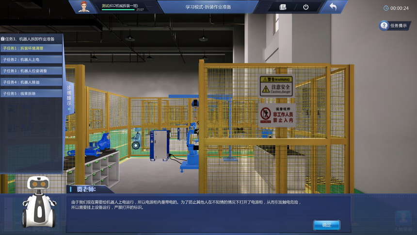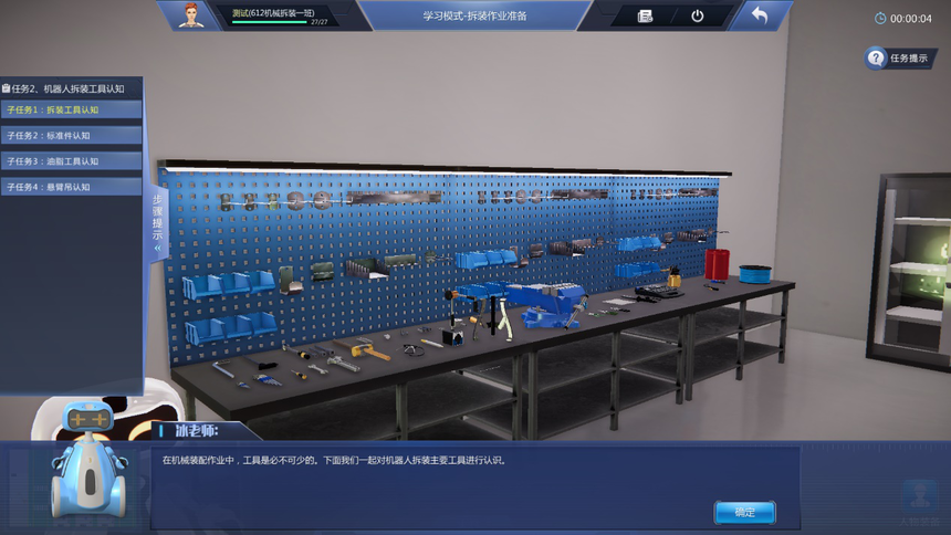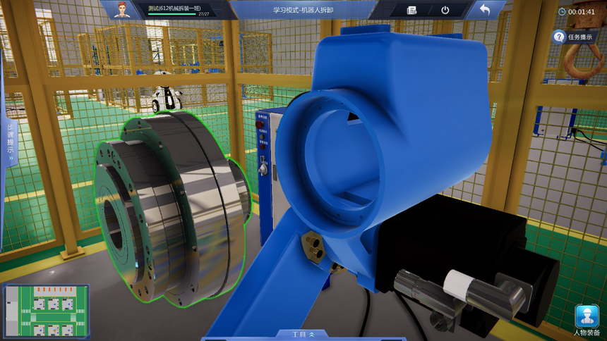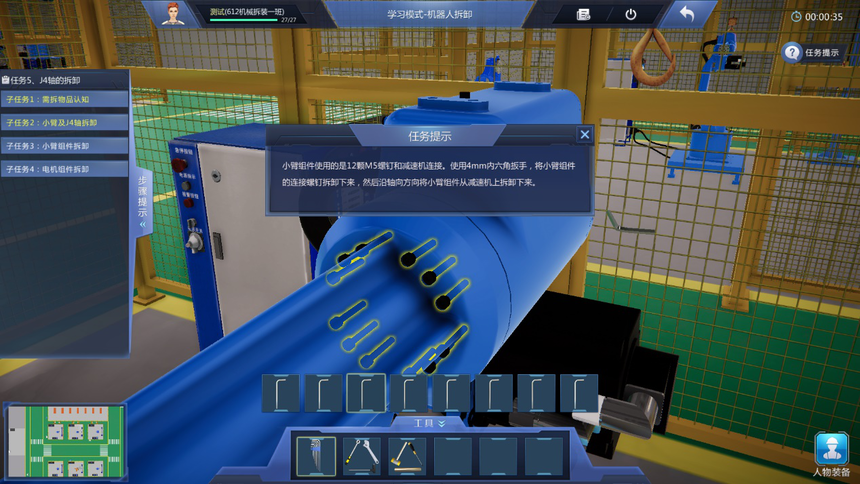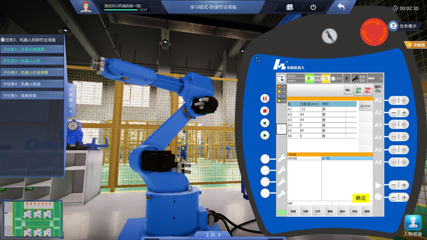 4、學(xué)習模式教學(xué)實(shí)訓任務(wù)豐富:機器人拆裝作業(yè)準備虛擬仿真實(shí)訓項目包含拆裝作業(yè)防護準備、機器人拆裝工具認知、機器人拆卸作業(yè)準備等至少3個(gè)教學(xué)實(shí)訓任務(wù);機器人本體拆卸虛擬仿真實(shí)訓項目包含機器人整體拆卸、機器人J6軸到J1軸的分步拆卸、諧波減速機的認知、RV減速機的認知等至少9個(gè)教學(xué)實(shí)訓任務(wù);機器人本體安裝虛擬仿真實(shí)訓項目包含機器人整體安裝、機器人J1軸到J6軸的分步安裝、機器人注油、軸承的認知、軸的初步認知等至少少10個(gè)教學(xué)實(shí)訓任務(wù)。機器人初步調試項目包含調試前準備、機器人開(kāi)機、機器人關(guān)機、機器人基礎調試、機器人精度檢測等至少5個(gè)教學(xué)實(shí)訓任務(wù)。