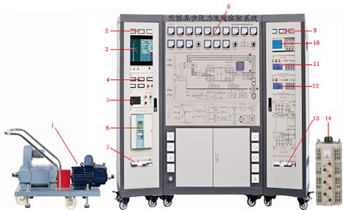 雙饋異步風(fēng)力發(fā)電實(shí)驗系統由雙饋異步發(fā)電機組、控制屏、變流器柜、大功率三相自耦調壓器、監控軟件六部分組成。
