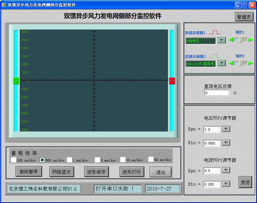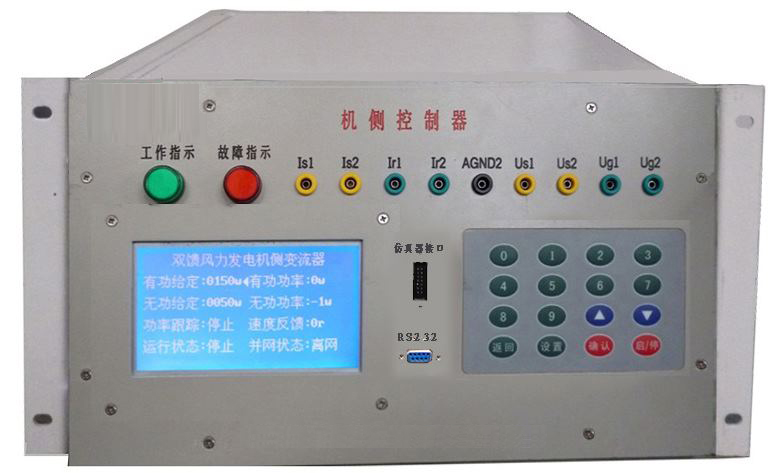 機側控制器的作用主要有兩個(gè)方面,一是給雙饋發(fā)電機的轉子提供勵磁分量的電流,從而可以調節雙饋發(fā)電機的定子側所發(fā)出的無(wú)功功率;二是通過(guò)控制雙饋發(fā)電機轉子轉矩分量的電流控制發(fā)電機的轉速或控制發(fā)電機定子側所發(fā)出的有功功率,從而使發(fā)電機運行在風(fēng)力機的*佳功率曲線(xiàn)上,實(shí)現*大風(fēng)能追蹤(捕獲)運行。機側控制器面板安裝有兩個(gè)信號指示燈,16鍵PVC軟鍵盤(pán),240*128點(diǎn)蘭色液晶屏及9個(gè)波形測試端子。信號指示燈可對控制器工作、保護狀態(tài)分別指示;鍵盤(pán)可完成機側控制器啟動(dòng)/停止設置,*大功率啟動(dòng)/停止跟蹤設置,有功/無(wú)功給定,手動(dòng)并網(wǎng)/離網(wǎng);液晶屏可顯示轉速反饋值,有功/無(wú)功反饋值;波形測試端子可通過(guò)示波器觀(guān)測發(fā)電機機轉子、定子相電流波形,可觀(guān)測發(fā)電機定子相電壓、電網(wǎng)相電壓波形。