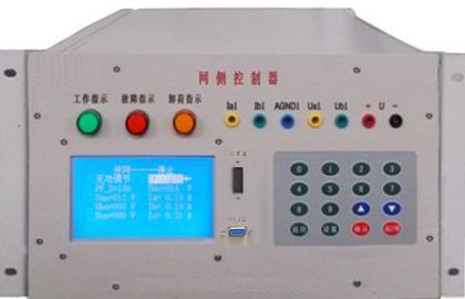 網(wǎng)側控制器面板安裝有三個(gè)信號指示燈,16鍵PVC軟鍵盤(pán),240*128點(diǎn)蘭色液晶屏及7個(gè)波形測試端子。信號指示燈可對控制器工作、故障、卸荷狀態(tài)分別給于指示,通過(guò)鍵盤(pán)可完成并網(wǎng)啟動(dòng)/停止設置。液晶屏可完成三相電流,電壓有效值顯示,直流母線(xiàn)電壓顯示;面板觀(guān)測孔可觀(guān)測電網(wǎng)相電流波形、相電壓波形及直流母線(xiàn)電壓波形。