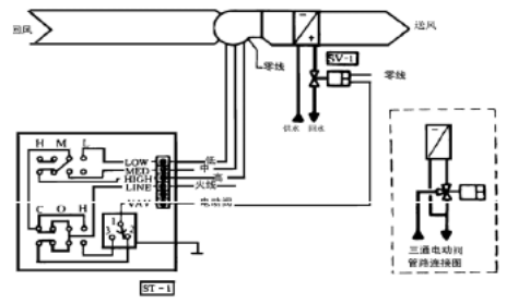 圖2為兩管制冷熱盤(pán)管電子控制器加電動(dòng)閥控制系統圖,圖中ST-1為風(fēng)機盤(pán)管控制器,它包括了模式選擇開(kāi)關(guān)、溫控器、風(fēng)機轉速選擇開(kāi)關(guān)三個(gè)部分。模式選擇開(kāi)關(guān)可選擇冷(C)、熱(H)和關(guān)(O)三種狀態(tài)。制冷時(shí)若室溫高于設定值,溫控器觸點(diǎn)1和2接通,電動(dòng)閥被打開(kāi),系統對室內提供冷氣。制熱時(shí)若室溫低于設定值,溫控器觸點(diǎn)1和3接通,電動(dòng)閥被打開(kāi),系統對室內提供暖氣。溫控器的設定溫度在5℃~30℃范圍內可調。風(fēng)機轉速選擇開(kāi)關(guān)可手動(dòng)選擇風(fēng)機的高、中、低三檔轉速。SV-1為安裝在盤(pán)管回水管上的電動(dòng)兩通閥,由溫控器控制,主要由它來(lái)控制盤(pán)管的冷熱量輸出。