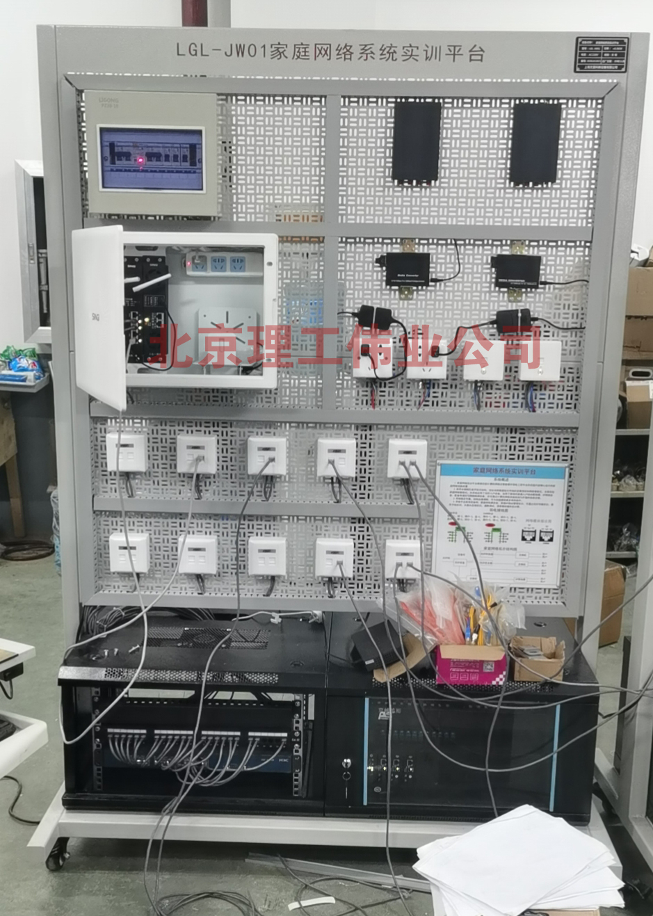 1、LGL-JW01型 家庭網(wǎng)絡(luò )系統實(shí)訓平臺設備采用開(kāi)放式網(wǎng)孔開(kāi)型臺架、網(wǎng)絡(luò )設備、工業(yè)鋁型材支架、高級噴塑鋼網(wǎng)孔掛板、電源控制器、配備工業(yè)用電源模塊、輔材及工具等組成;配備有移動(dòng)腳輪,方便移動(dòng)及安裝。