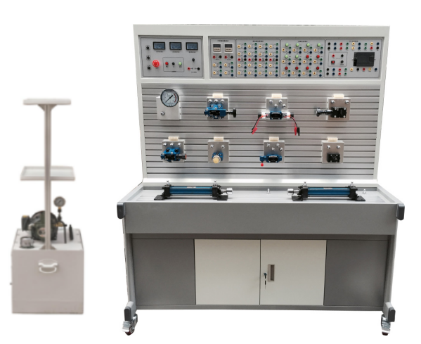 1、液壓與氣壓傳動(dòng)PLC控制綜合實(shí)訓裝置由實(shí)訓臺、實(shí)訓桌、電源模塊、PLC電氣控制模塊、繼電器控制模塊、控制按鈕模塊、時(shí)間繼電器模塊、液壓泵站、液壓元件、氣泵、氣動(dòng)元件等組成。