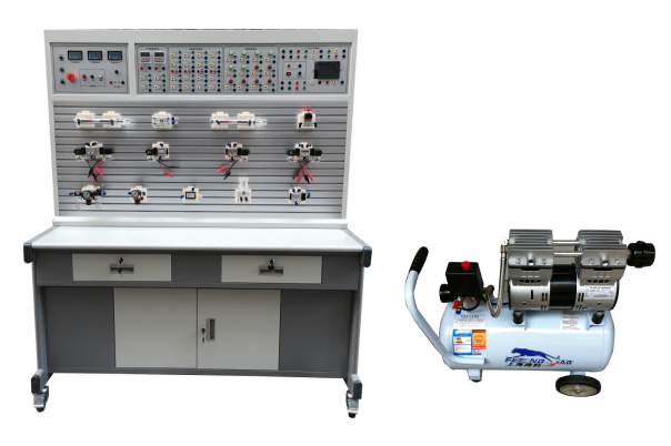 2、多功能氣動(dòng)教學(xué)實(shí)驗臺由實(shí)訓桌、實(shí)訓臺為鐵質(zhì)雙層亞光密紋噴塑結構,實(shí)訓桌柜內存放液壓元件等。