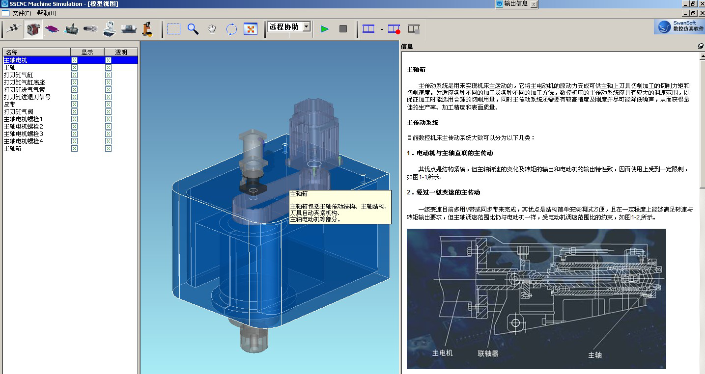 (4)軟件具有平床身、斜床身、加工中心、減速器、齒輪泵的結構拆裝模塊:包括刀庫、主軸系統、十字滑臺、X軸伺服進(jìn)給、Y軸伺服進(jìn)給、Z軸伺服進(jìn)給、加工中心整體、拖板結構、主軸箱、刀架、平床身Z伺服進(jìn)給、平床身整體、斜床身伺服進(jìn)給、斜床身拖板結構、斜床身刀架、斜床身尾座、斜床身整體、減速器整體、視孔蓋、輸出軸、輸入軸、齒輪泵整體部分。拆裝具有示教拆裝和手動(dòng)拆裝功能,同時(shí)提供快速組件裝配和爆炸圖的功能,可以一步裝配好組件也可以從無(wú)到有組裝組件。拆裝過(guò)程提供工藝提示。