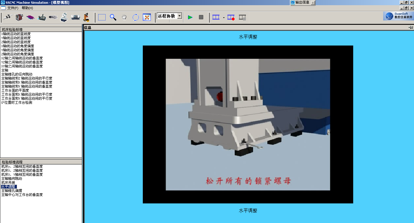 (1) 同時(shí)提供裝配的檢驗標準及檢驗流程動(dòng)畫(huà)。包括:X軸直線(xiàn)度檢測、Y軸直線(xiàn)度檢測、Z軸直線(xiàn)度檢測、X軸角度偏差檢測、Y軸角度偏差檢測、Z軸角度偏差檢測、XZ軸垂直度檢測、YZ軸垂直度檢測、XY軸垂直度檢測、主軸錐孔跳動(dòng)檢測、主軸軸線(xiàn)與Z軸平行度檢測、主軸軸線(xiàn)與X軸垂直度檢測、主軸軸線(xiàn)與Y軸垂直度檢測、工作臺平面度檢測、工作臺和X軸平行度檢測、工作臺與Y軸平行度檢測以及機床吊裝、機床水平調整、主軸中心對工作臺垂直度調整等。