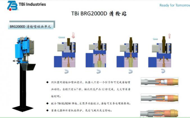 (2)德國TBi BRG-2000D清槍剪絲機構清槍全程只需6-7秒,相比其它同類(lèi)產(chǎn)品12秒完成,大大節約的機器人清槍時(shí)間,更高的提高機器人的工作效率。
