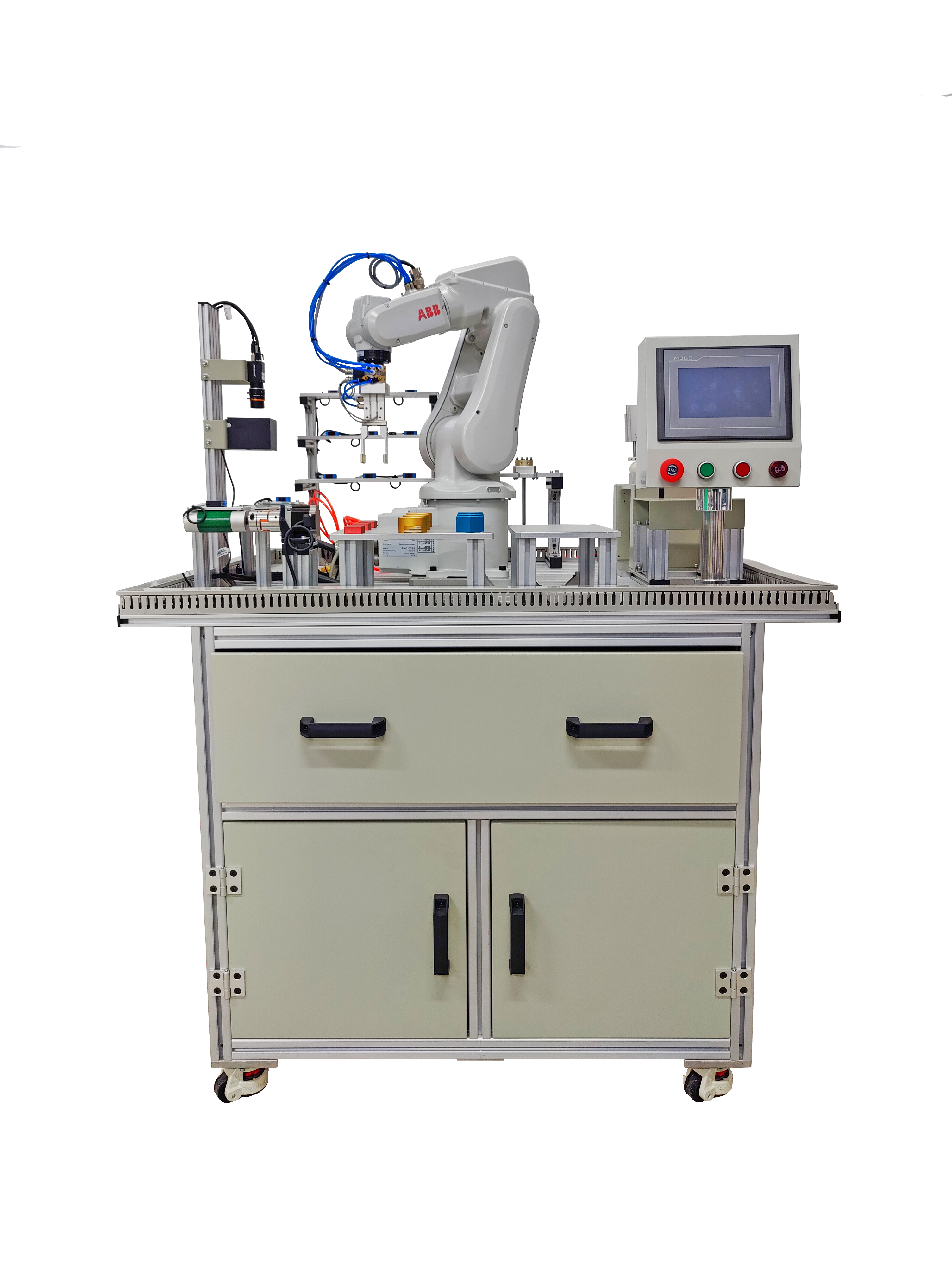 (1)整個(gè)平臺為立式結構,主要框架和工作面采用工業(yè)鋁型材搭建,電器柜可以安裝工控機、IO口擴展板、電磁閥安裝位置、變頻器安裝位置、PLC安裝位置,電氣接線(xiàn)部分為抽屜式結構,便于接線(xiàn),預留擴展區域,便于設備的擴展。工作平臺為可以靈活安裝各功能模塊的導槽式或矩陣螺絲孔式。尺寸:≥1200mm×1000mm×900mm;材料:鋁合金+鋼板;平臺面板為多用途可擴展設 計方式,擴展靈活;采用氣動(dòng)夾具:最大負載能力:≥3kg;最大抓取范圍:≥15cm×15cm;最高抓取精度:≥1mm;帶安裝機架。