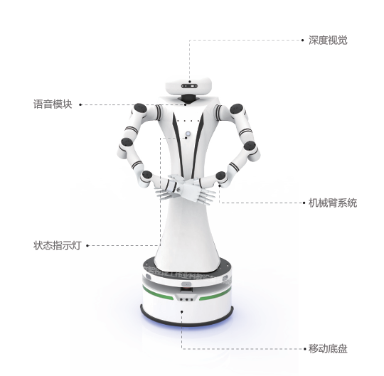 一.機器人整體組成:不少于1個(gè)主控模塊、不少于1個(gè)移動(dòng)底盤(pán)、不少于2條七軸機械臂、不少于1個(gè)末端執行器、不少于1個(gè)深度視覺(jué)傳感器;