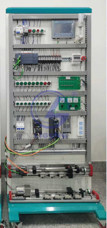 4、電氣控制實(shí)訓板上主要硬件有:空氣開(kāi)關(guān)、變頻器、伺服驅動(dòng)器、電源保護及操作按鈕和指示燈、PLC、觸摸屏、24VDC 50W開(kāi)關(guān)電源、模擬量輸出驅動(dòng)調壓模塊等控制器件。