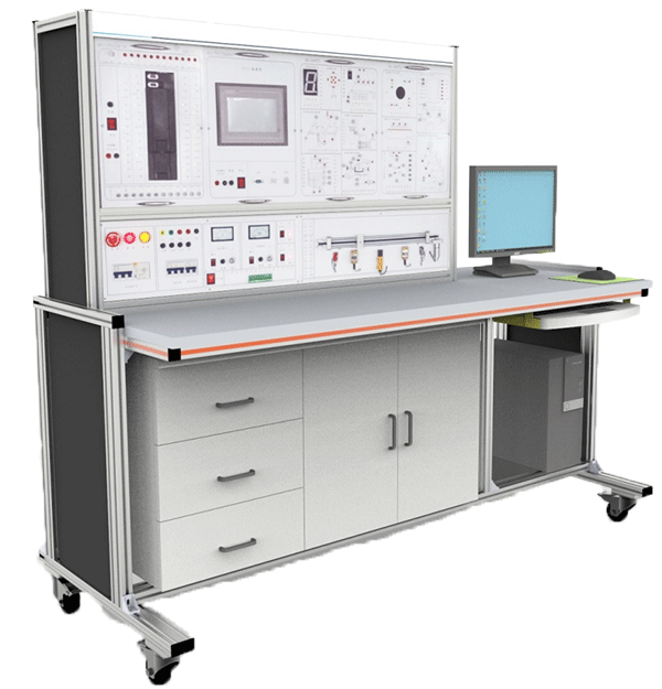 2、臺架構成:實(shí)訓臺采用工業(yè)鋁型材加工。桌面下面放置儲物柜,左側有3層抽屜,用于存放工具以及實(shí)訓資料,右側為雙拉門(mén)式設計,可以放置實(shí)訓掛箱。底部裝有四個(gè)帶鎖止功能的萬(wàn)向輪。柜體后下側留有電源輸入線(xiàn)。預留計算機放置位置。