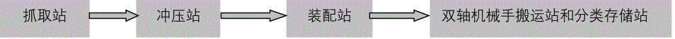 裝有Tag的料塊,經(jīng)過(guò)傳感器的檢測區分出料塊的顏色和材質(zhì),在擋料氣缸處等待,蓋子的顏色和材質(zhì)經(jīng)過(guò)1#傳輸皮帶和2#傳輸皮帶上的傳感器分辨出來(lái),經(jīng)過(guò)伸出氣缸和真空吸盤(pán)放到裝有Tag的料塊上,經(jīng)皮帶傳送到倉儲站 |