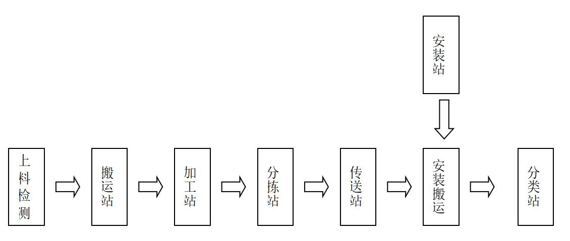 下圖給出了系統中工件從一站到另一站的物流傳遞過(guò)程:上料檢測單元將大工件按順序排好后提升送出;搬運站將大工件從上料檢測單元搬至加工站;加工站將大工件加工后送出工位;分揀站將加工過(guò)的正常的工件搬運到傳送站,如果是廢料,分揀機械手將工件搬運到廢料處理機構;傳輸站將正常的大工件送至尾端,將廢料分揀到廢料槽里;安裝搬運站將大工件從傳輸站搬至安裝工位放下。安裝站再將對應的小工件裝入大工件中。而后,安裝搬運站再將安裝好的工件送分類(lèi)站,分類(lèi)站再將工件送入相應的料倉。