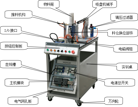 該系統上使用了大量的氣動(dòng)元件,包括多種電控氣動(dòng)閥、多種氣動(dòng)缸、氣動(dòng)夾爪、真空吸盤(pán)、真空發(fā)生器、過(guò)濾減速閥等。在學(xué)習這些氣動(dòng)元件時(shí),不但可以單獨學(xué)習每一種分離元件,而且還可以在學(xué)習時(shí)了解各種氣動(dòng)元件之間,以及氣動(dòng)元件與其它元件之間,如何配合起來(lái)并協(xié)調進(jìn)行工作的。