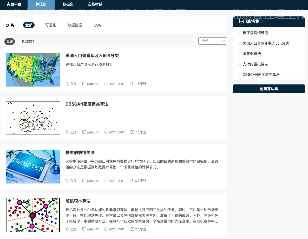 人工智能實(shí)訓課程資源共計200多個(gè),資源涵蓋了操作系統類(lèi)、數據庫類(lèi)、編程語(yǔ)言類(lèi)、統計分析類(lèi)、機器學(xué)習類(lèi)、神經(jīng)網(wǎng)絡(luò )與深度學(xué)習類(lèi)、自然語(yǔ)言處理類(lèi)、機器視覺(jué)類(lèi)、智能硬件類(lèi)課程等諸多方面課程,課程類(lèi)型包括基礎實(shí)訓、關(guān)鍵技術(shù)掌握、應用創(chuàng )新等,是一個(gè)綜合性的學(xué)習研究平臺;平臺配合專(zhuān)用的資源監控系統、課程監控系統,可實(shí)時(shí)的監控整個(gè)平臺的硬件資源負載以及學(xué)生學(xué)習的狀態(tài),可幫助教師合理的安排課程及對應資源。