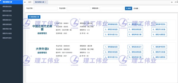 課程大綱管理模塊針對每一門(mén)課程,詳細的定義了課程的詳細內容,包括基本信息,授課教師,教學(xué)目標,教學(xué)單元,教學(xué)方式,評價(jià)方式等等。