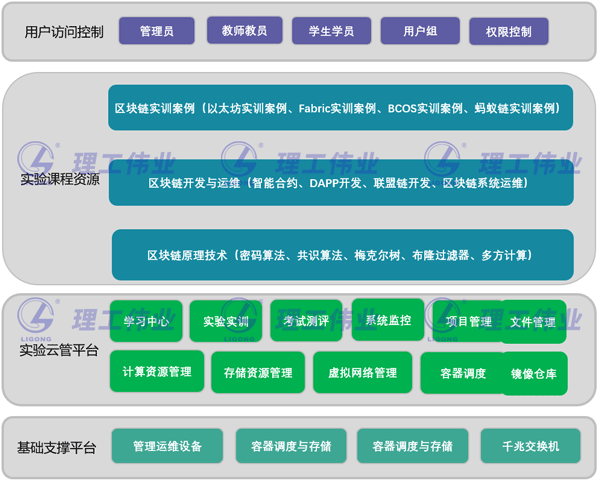 區塊鏈實(shí)驗教學(xué)平臺的的產(chǎn)品設計由下而上分為四層,即:基礎支撐平臺、實(shí)驗云管平臺、實(shí)驗課程資源、用戶(hù)訪(fǎng)問(wèn)控制。