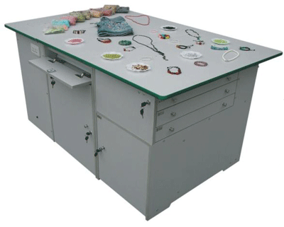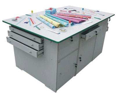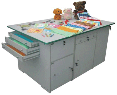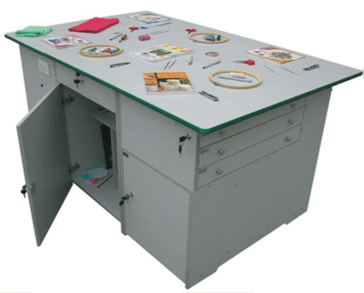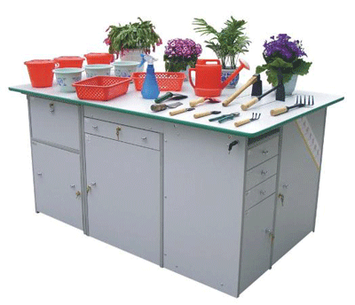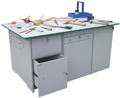 功能:桌體材料選用16mm厚優(yōu)質(zhì)雙貼面三聚氰胺板和30mm×30mm角鋼組成,桌體板截面選用優(yōu)質(zhì)PVC封邊經(jīng)全自動(dòng)封邊機加溫180攝氏度膠封。桌面材料選用(A型)18mm厚優(yōu)質(zhì)雙貼面三聚氰胺板或(B型)25mm后成型防火貼面密度板,桌面板截面選用綠色T型PVC封邊槽封。桌體設計由三獨立單元組合在一起,例如金工、木工、洗滌為A獨立單元,烹飪、電工與電子為B獨立單元,縫紉與裁剪、手工工藝為C獨立單元。如果A獨立單元或B獨立單元單獨操作時(shí),桌面可翻轉自如,而且各獨立單元的配備都儲放在各自獨立單元桌體里面。